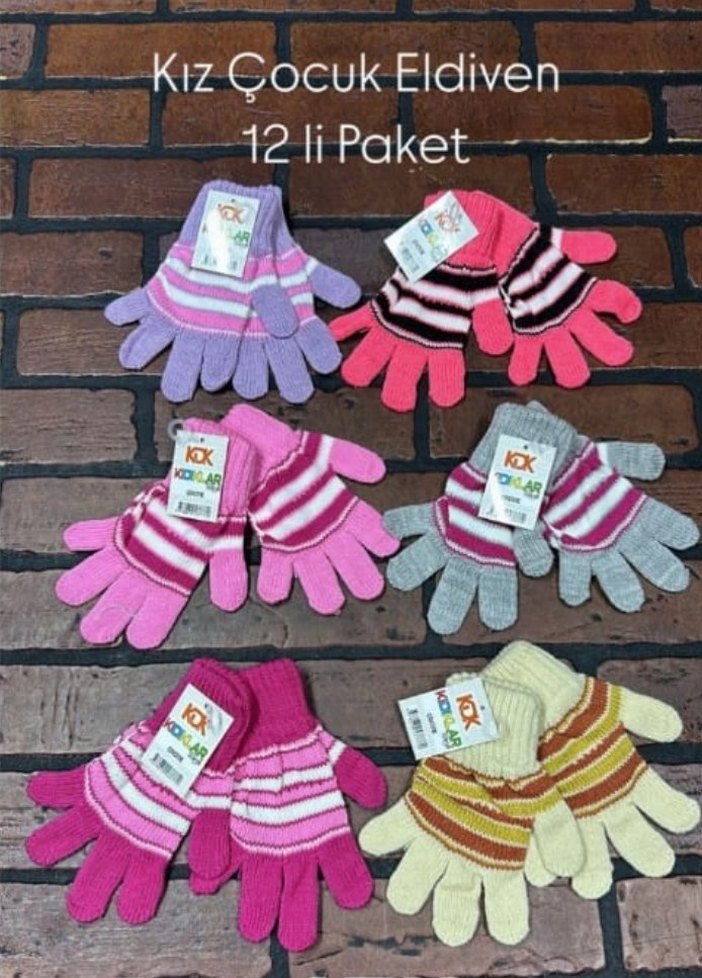 Kız çocuklar için nakışlı desenli, renkli örgü 12'li eldiven paketi. Yumuşak örgü kumaştan üretilmiştir, sıcak ve şık bir kullanım sunar. Toptan satışımız mevcuttur.