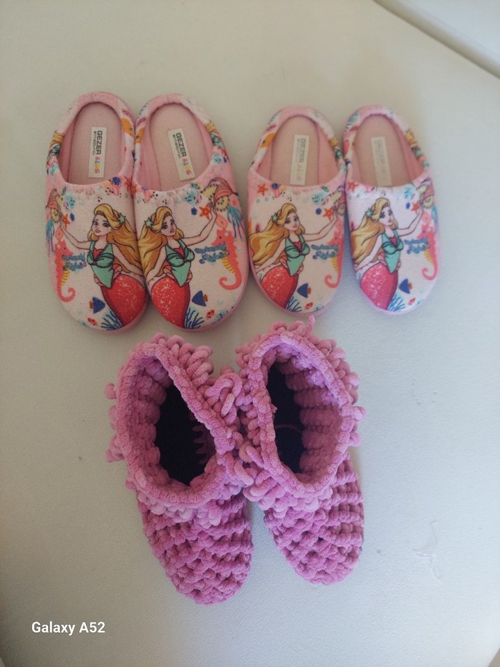 Kız çocukları için renkli nakışlı desenlere ve yumuşak örgü dokusuna sahip sıcak terlikler. Bohem tarzda, pembe renkte ve rahat örgü yapıda.
