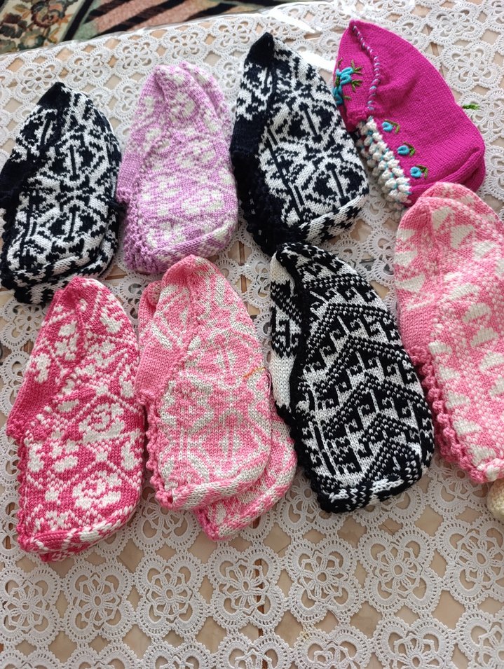 Renkli nakışlı desenlere sahip kız çocuk örgü sıcak ev terlikleri. Bohem ve retro tarzda, yumuşak ve rahat iç mekan kullanımı için.