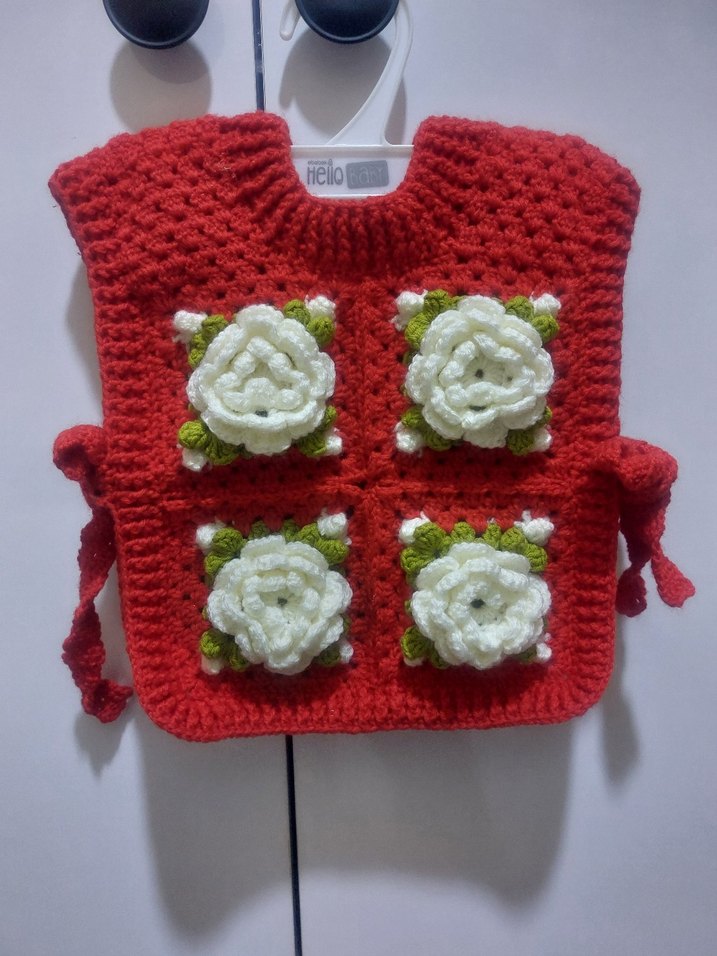 Kız çocukları için örgü kumaştan, salaş kesim, kolsuz panço. Yuvarlak yaka ve kırmızı zemin üzerine renkli nakışlı çiçek desenleri bulunur.