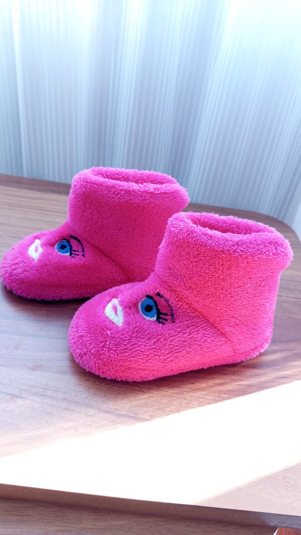 Kız çocuklar için renkli, pembe nakışlı ve sıcak örme kumaştan yapılmış ev terliği, trendi rahat stil için uygundur.