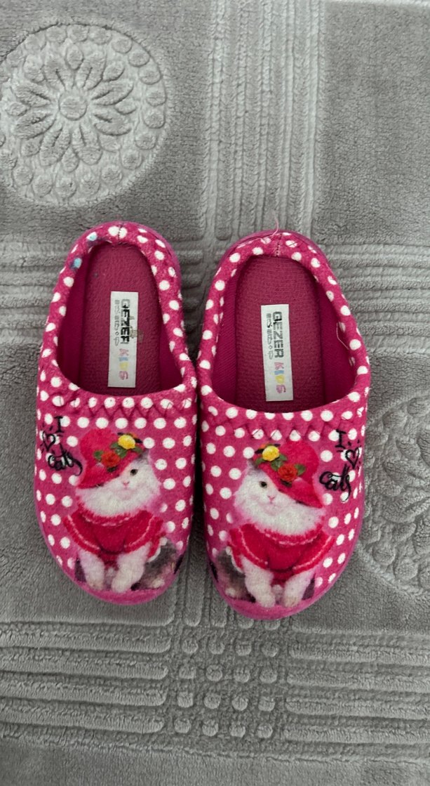 Kız çocukları için renkli nakışlı kedi desenli, yumuşak kürk dokulu sıcak ev terliği. Pembe renkte, bohem ve retro tarzda rahat bir model.