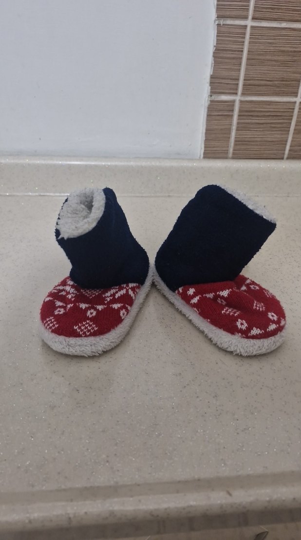 Nakışlı desenli, renkli çocuk pandufu, yumuşak ve sıcak kürk astarlı. Geleneksel tarzda, soğuk günler için uygun.
