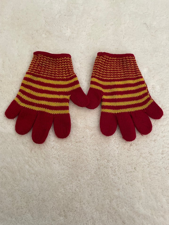 Kız çocukları için renkli kırmızı ve sarı çizgili, nakış detaylı triko eldiven. Yumuşak triko kumaş rahatlık ve sıcaklık sağlar.