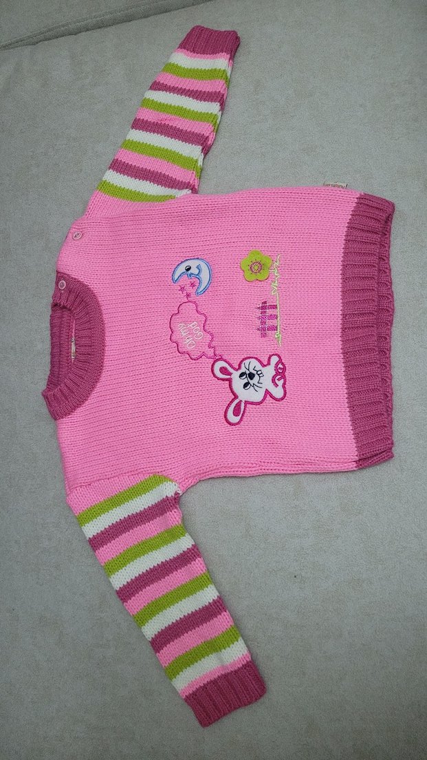 Yumuşak fleece kumaştan, uzun renkli çizgili kollu, önünde renkli nakış detayları bulunan pembe renkli, fitted kesim kız çocuk triko kazak.