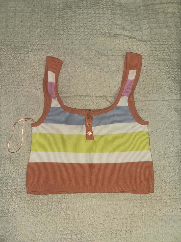 Kız çocukları için örgü dokulu, askısız yaka ve fitted kesime sahip, renkli çizgili desenli crop top. Bohem ve retro stil için uygun.