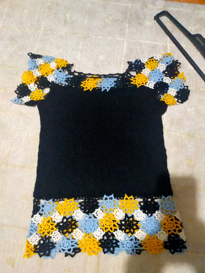 Kız çocuklar için kısa kollu, kayık yaka, renkli çiçek desenli örgü bluz. Bohem tarzda, canlı renklerle tasarlanmıştır.