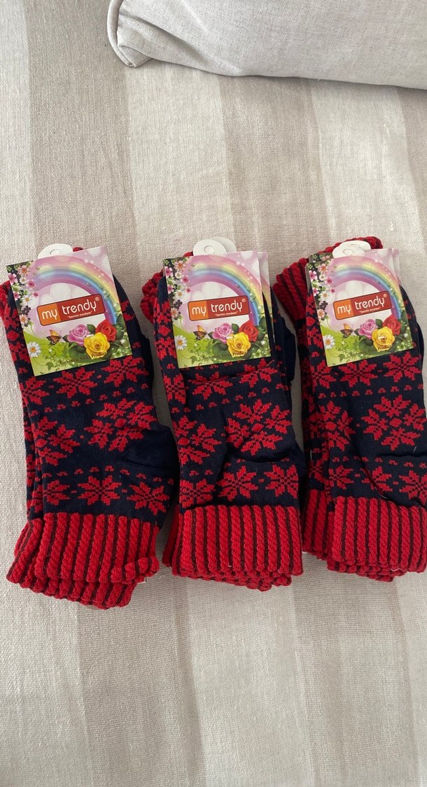 Kız çocukları için kırmızı ve lacivert renklerde desenli örgü çoraplar. Lastikli manşetli ve 'my trendy' etiketiyle birlikte geliyor.