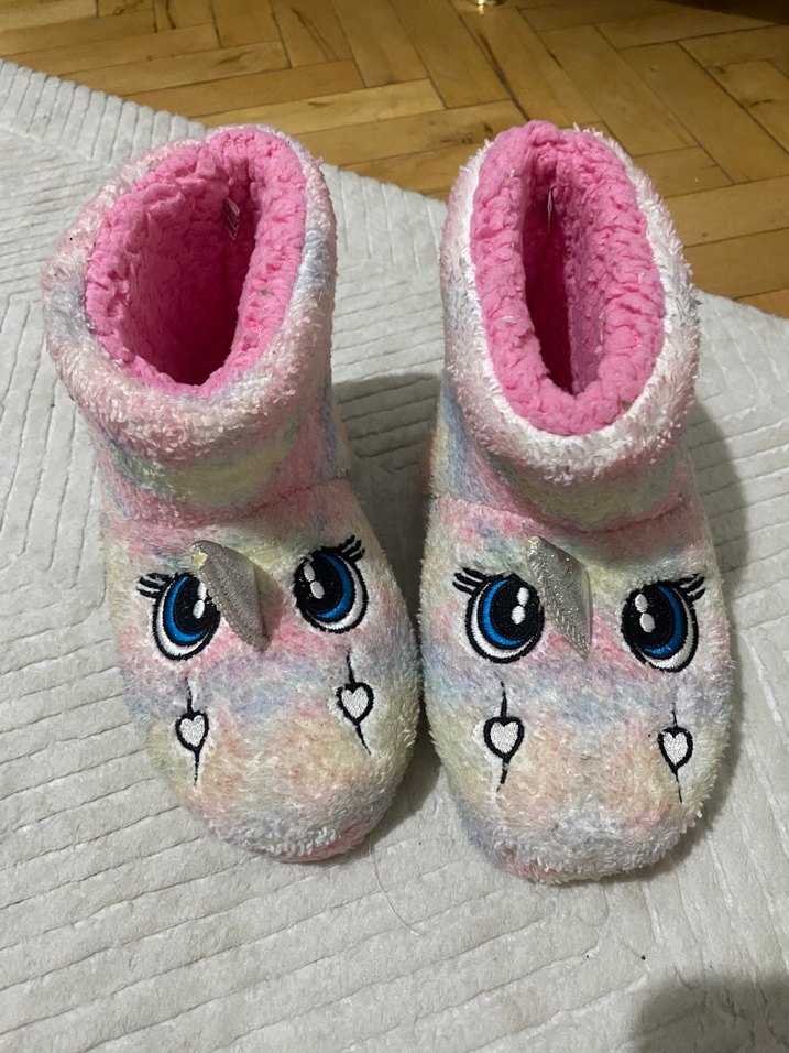 Kız çocukları için örgü, pastel renklerde tie-dye desenli ve yumuşak fleece astarlı sıcak ev terliği. Önde sevimli işleme gözler ve kalpler bulunur.