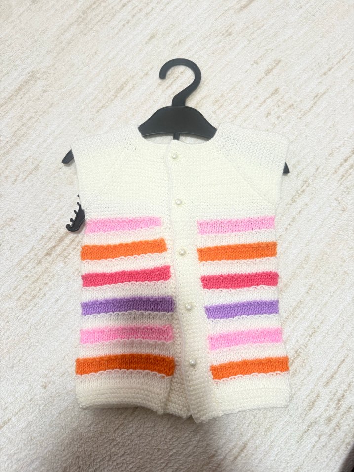 Kız çocukları için kolsuz örme hırka, beyaz zemin üzerinde renkli yatay çizgilerle ve düğmeli ön kapamayla tasarlanmıştır. Sokak stili için uygundur.