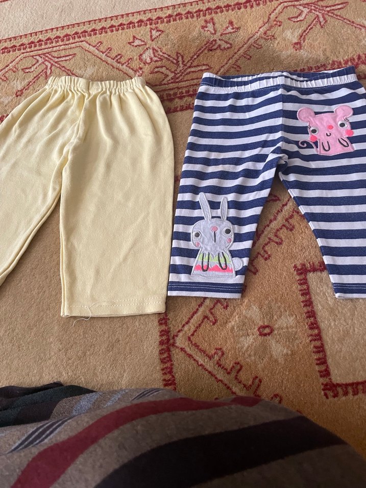 Yumuşak pamuktan, elastik bel bantlı kız çocuk taytları. Biri düz sarı, diğeri çizgili ve sevimli hayvan baskılı. Günlük kullanım için uygundur.