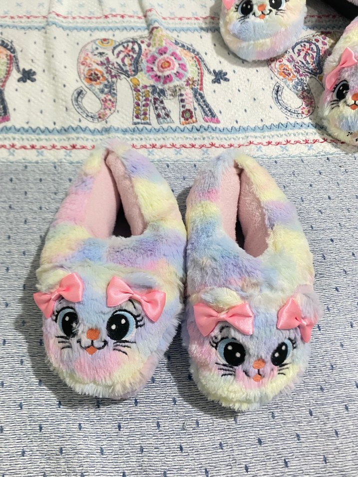 Kız çocukları için pastel renkli tie-dye desenli, yumuşak kürk detaylı ve sevimli hayvan yüzlü ev terlikleri, trend günlük kullanıma uygun.numarası yazmıyor o yüzden alt tabanını ölçer söylerim