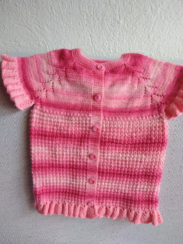 Renkli pembe, kolsuz, fitted kesim kız çocuk örgü kazak. Bohem tarzda fırfırlı kenarları vardır.