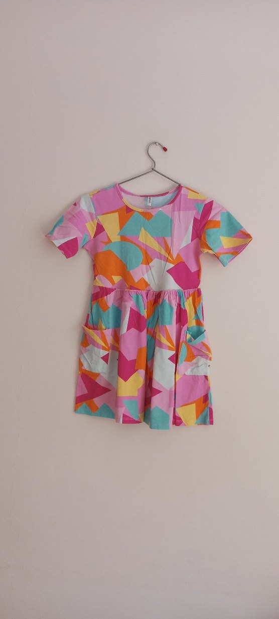 Renkli kız çocuk elbisesi, kısa kollu, yuvarlak yakalı ve pilili etekli rahat kesime sahiptir. Yumuşak sentetik kumaştan, pop kültür desenlidir. çok az kullanildi