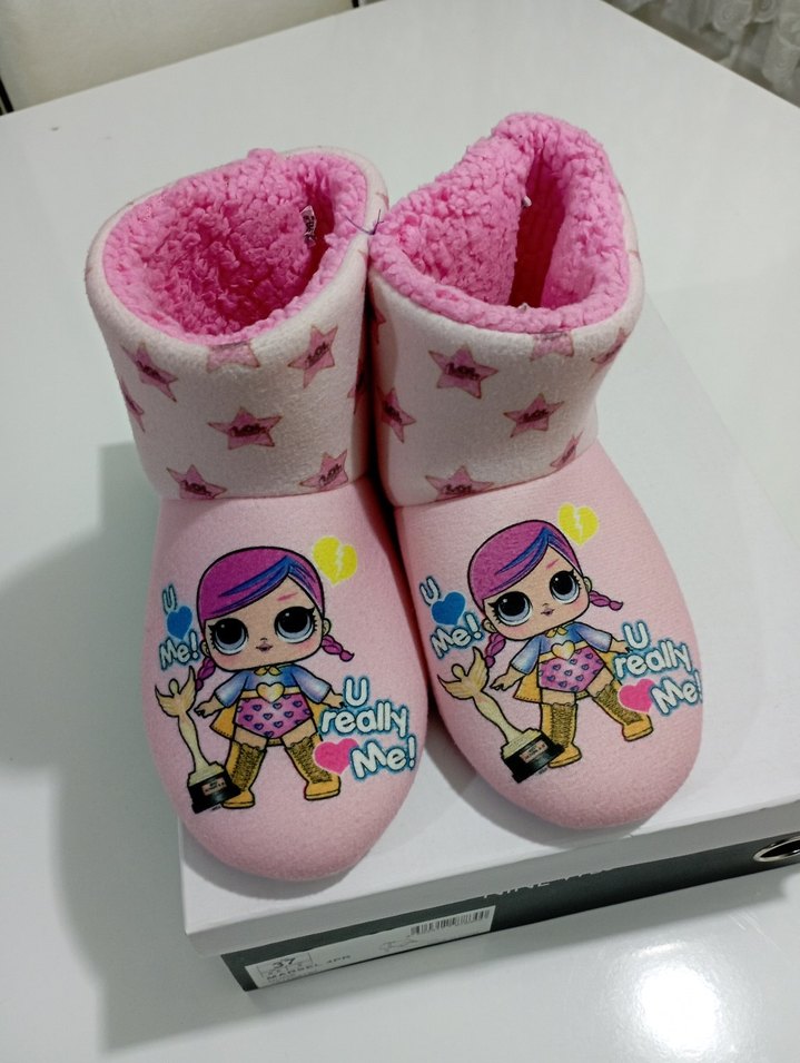 Kız çocukları için pembe renkli, pop kültür baskılı, örgü dokulu sıcak panduf. Rahat ve sıcak tutar.