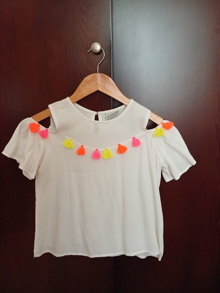 Pamuk kumaştan, bol kesim, kısa kollu, bisiklet yaka kız tişörtü. Renkli püsküllerle süslü, bohem tarzda. 1 kere giyildi