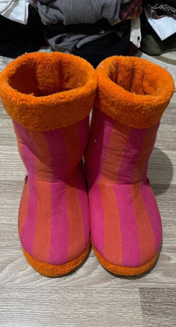 Kız çocukları için renkli çizgili, yumuşak ve örgü dokulu, turuncu kürklü sıcak ev botları. Pop kültür tarzına uygun.