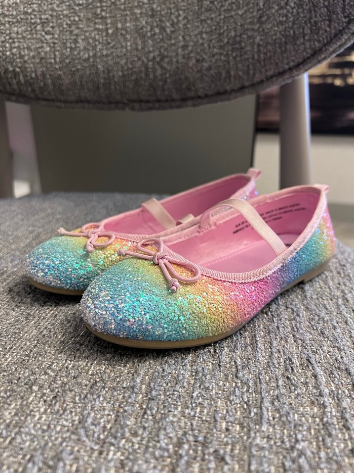 Kız çocukları için pastel tonlarda bağlama desenli simli babet ayakkabılar. Kauçuk tabanlı, günlük kullanıma uygun şık ve rahat bir model. Çok az kullanıldı.