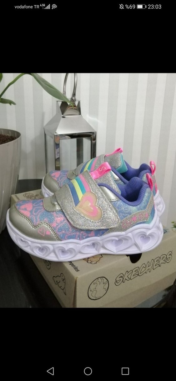 Renkli kız çocuk spor ayakkabıları simli detaylar ve bağcıksız cırt cırtlı tasarıma sahiptir. Rahat kauçuk tabanlıdır. SKECHERS marka. 26 numara genel olarak tertemizdir yırtık sökük VS yoktur sıfır sayılır sadece ışıkları yanmıyor onun dışında pırıl pırıl yepyeni