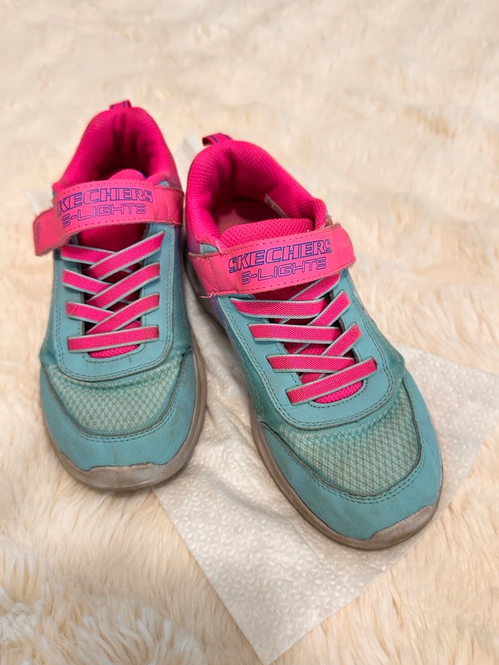 Kız çocukları için renkli Skechers spor ayakkabılar, bağcık ve cırt cırtlı bantlı, kauçuk tabanlıdır. Rahat ve gündelik kullanıma uygundur.