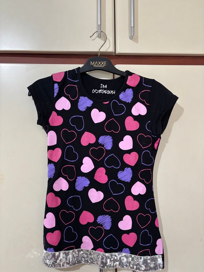 Etek ucu payetli rengarenk kalpli tişört