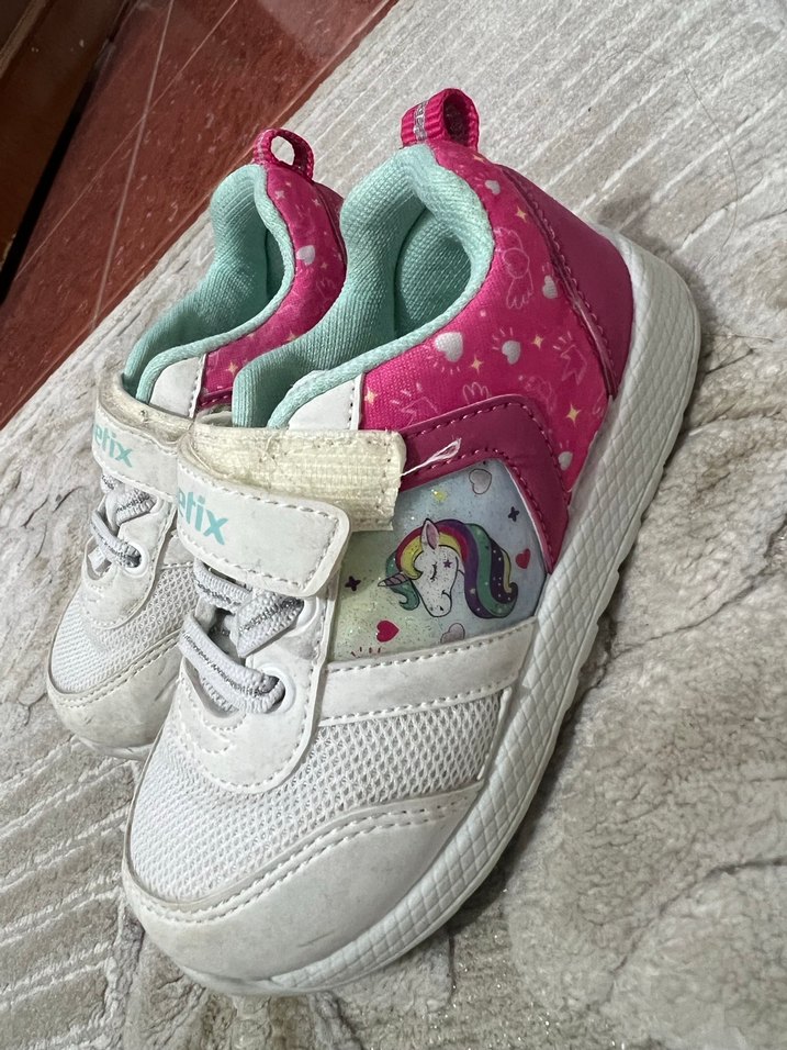 Kız çocukları için renkli unicorn desenli, pembe ve beyaz spor ayakkabılar. Kolay giyim için cırt cırtlı bant ve kauçuk taban bulunur.