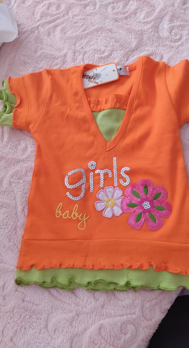 Renkli kız çocuk tişörtü, V yaka ve dantel detaylı kısa kollu. Baskılı çiçek desenli, yumuşak sentetik kumaştan, dar kesim.