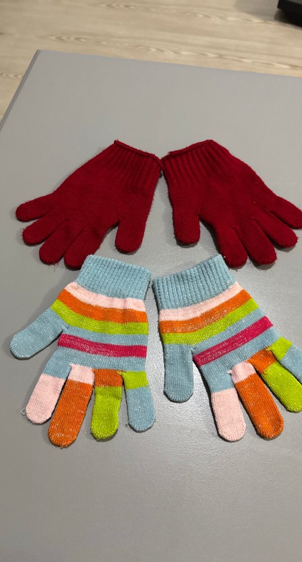 Kız çocukları için örgü iki çift eldiven; biri düz kırmızı, diğeri renkli çizgili. Yumuşak ve rahat malzemeden yapılmıştır.
