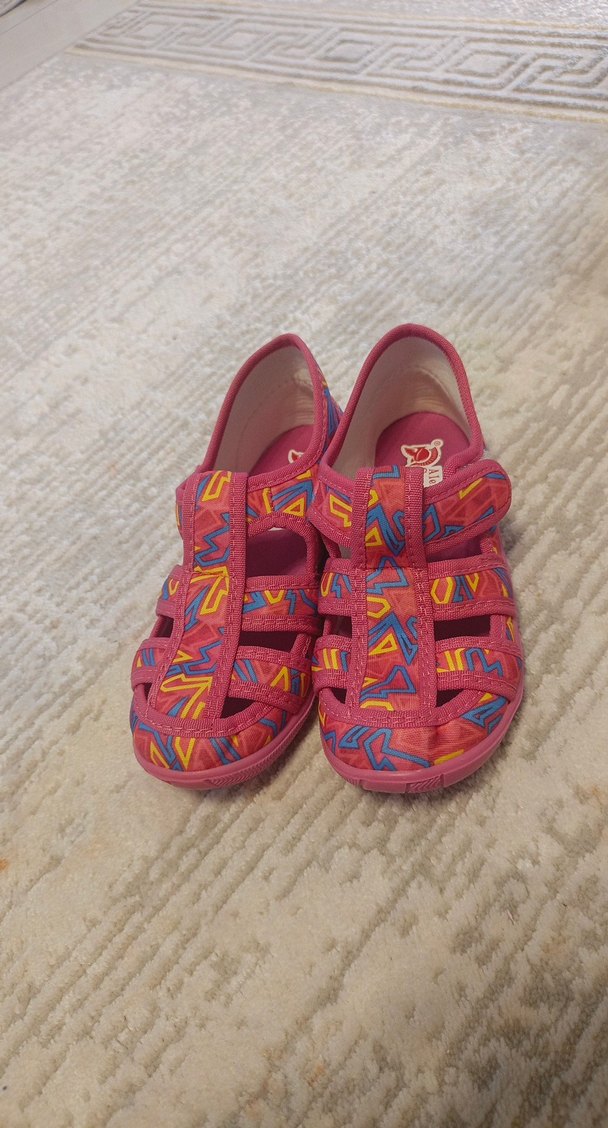 Kız çocukları için renkli tie-dye desenli, pembe tabanlı ve ayarlanabilir velcro bantlı sandaletler. Kauçuk malzemeden üretilmiştir, rahat ve dayanıklıdır.
