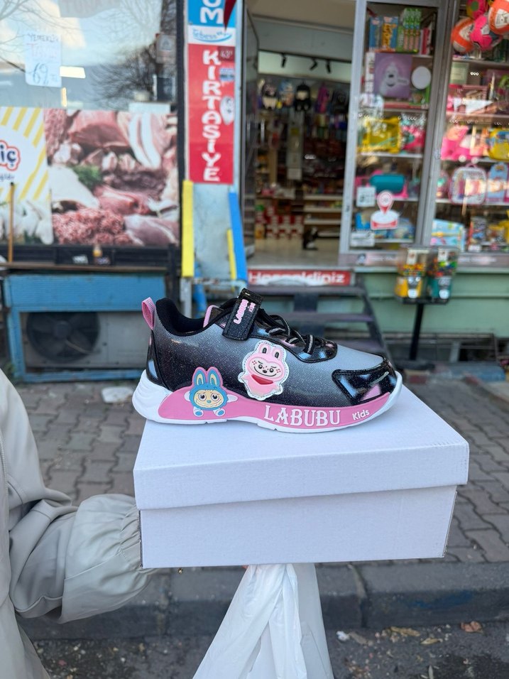 Kız çocukları için renkli, baskılı desenli, pembe tabanlı ve velcro kapamalı spor ayakkabı. Kauçuk malzemeden üretilmiştir.