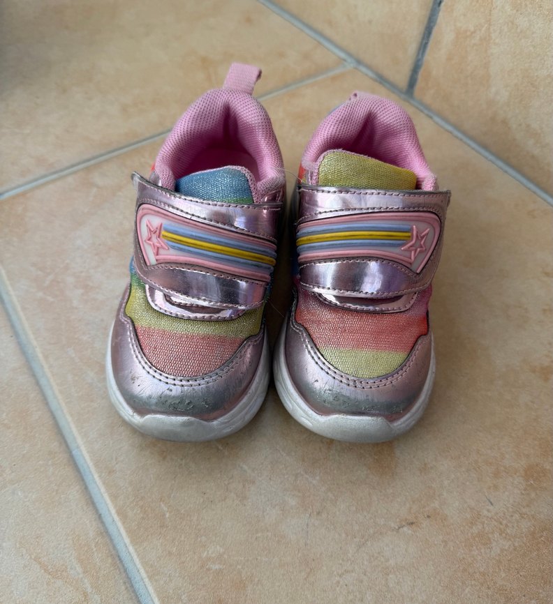 Bağcıksız, renkli tie-dye desenli kız çocuk spor ayakkabısı. 24 numaradır çok rahat bir ayakkabı olduğu için bizde boy boy bu ayakkabıdan var. Her iki ışığı da yanıyor kullanıma engel hiçbir sorunu yoktur.