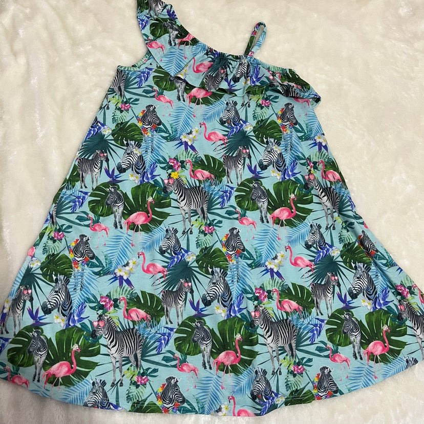 Renkli zebra desenli kız çocuk elbisesi, fırfır detaylı ve kısa kolludur. Askılı ve bol kesimdir, yumuşak sentetik kumaştan yapılmıştır.