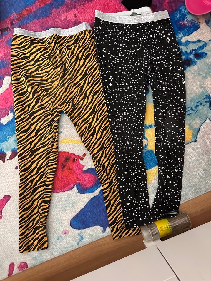 Sentetik kumaştan, elastik bel bantlı, renkli zebra ve yıldız desenli kız çocuk taytları, sokak modasına uygun sıkı kesim. İkisinin toplam fiyatıdır