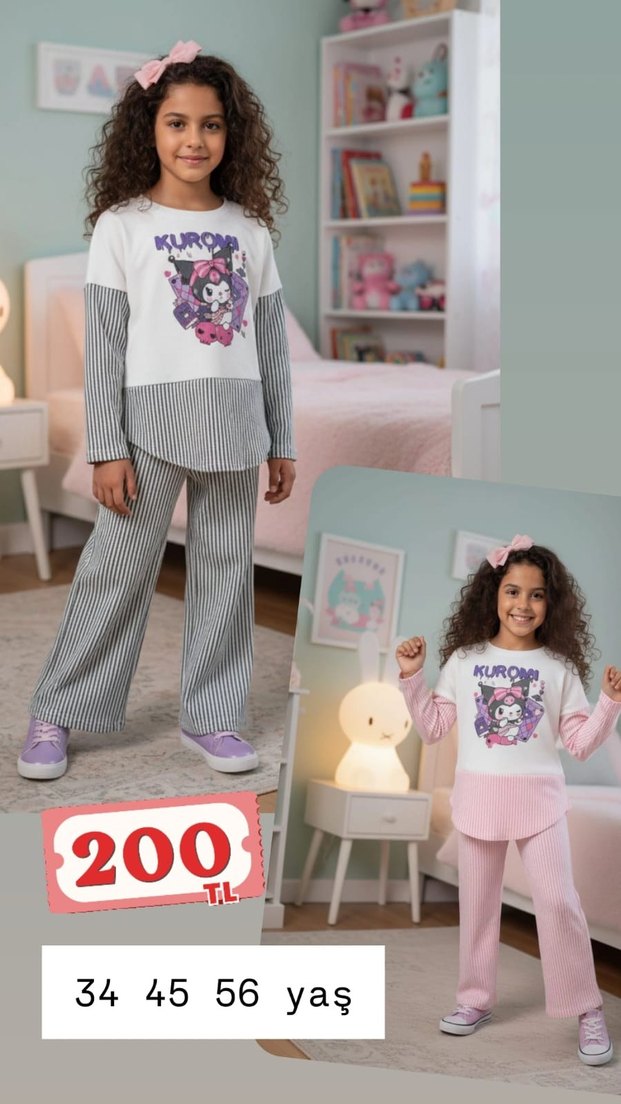 Pamuklu kumaştan, salaş kesim kız çocuk eşofman takımı. Uzun kollu, bisiklet yaka, kabartmalı kollu ve çizgili desenli rahat stil. Pembe ve gri renk seçenekleriyle.