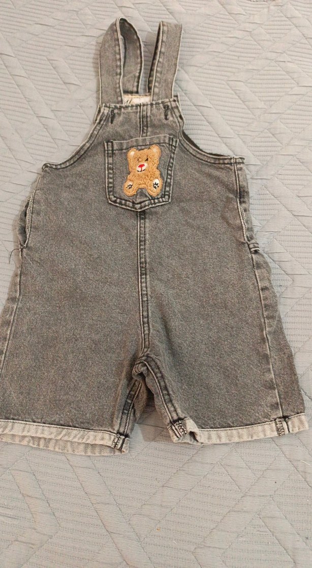 Gri kot kumaştan, düğmeli yan detaylı, kahverengi nakışlı ayıcık desenli, kolsuz, fitted erkek salopet. Sokak stili için uygun.