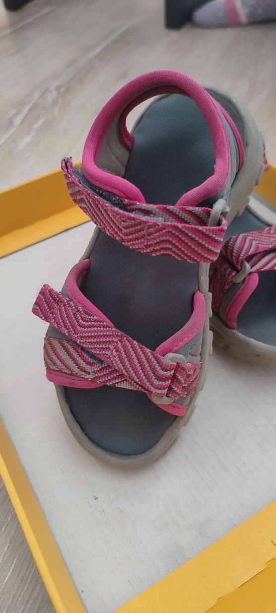 Kız çocukları için pembe ve gri renklerde, tokalı kayışlara sahip kauçuk sandalet. Rahat ve şık sokak tarzı için uygun. Çok hafif az kullanılmış