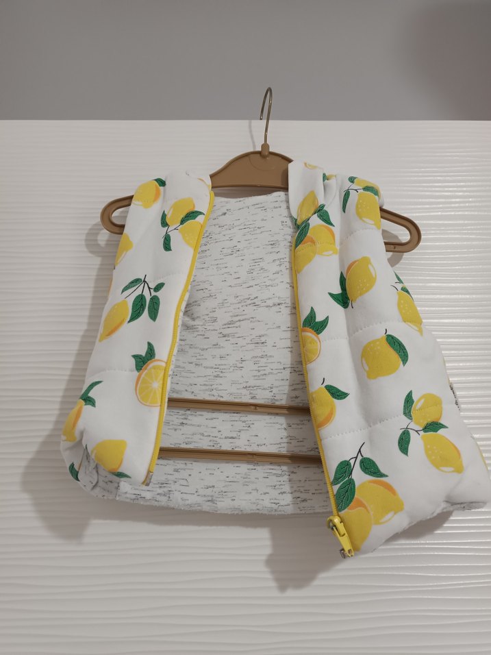 Sarı limon baskılı, fermuarlı, kolsuz, halter yakalı kız çocuk yeleği. Sentetik kumaştan, fit kesimle tasarlanmıştır.