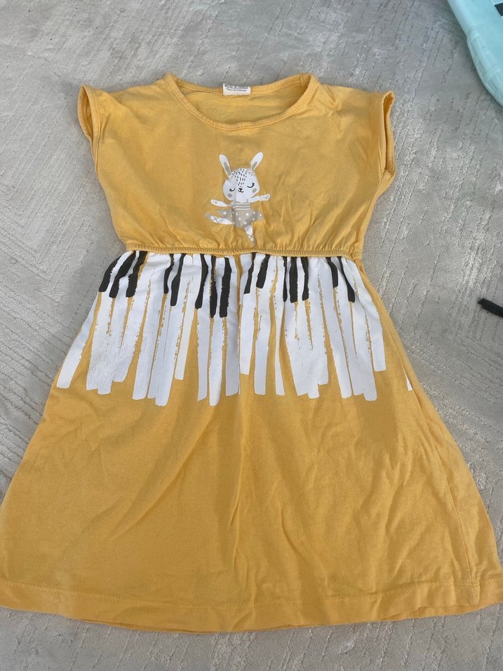 Kısa kollu, straplez yaka ve fırfır detaylı sarı kız çocuk elbisesi. Belinde piyano tuşları desenli, sentetik yumuşak kumaştan, sokak modasına uygun.