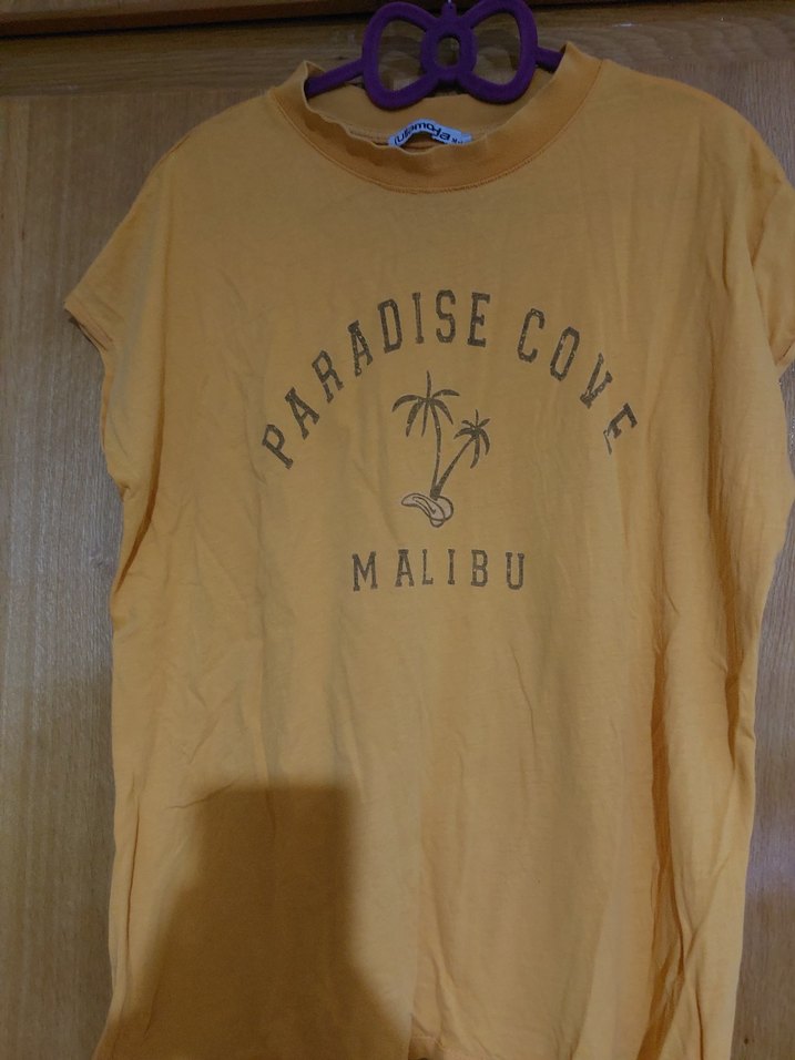 Pamuklu, pastel sarı renkli, bol kesim ve bisiklet yaka kız çocuk tişörtü. Önünde "Paradise Cove Malibu" ve palmiye baskısı bulunur.