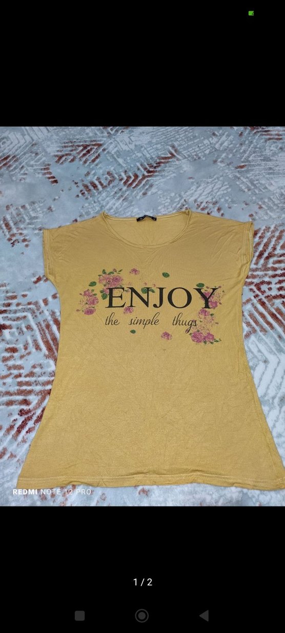 Sarı pamuk kız çocuk tişörtü, kısa kollu ve bol kesim. 'ENJOY the simple things' yazılı renkli baskı ve elastik detay içerir. Yuvarlak yakalı, streetwear tarzında.