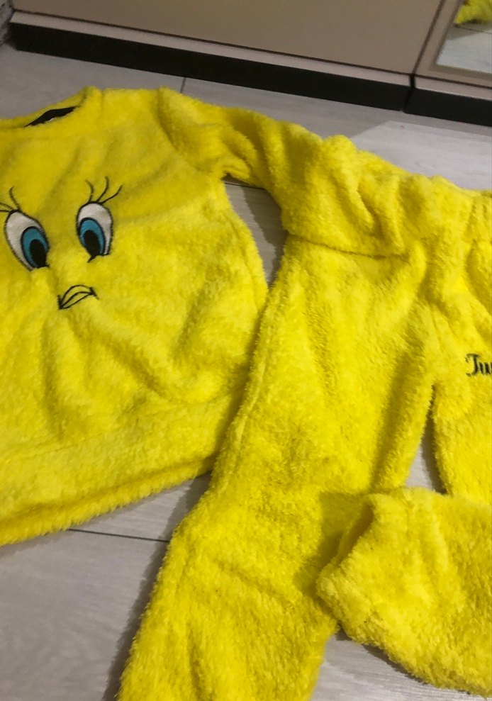 Kız çocukları için yumuşak ve sıcak sarı kumaştan, renkli baskılı peluş pijama takımı. Rahat ve konforlu kullanım sağlar.