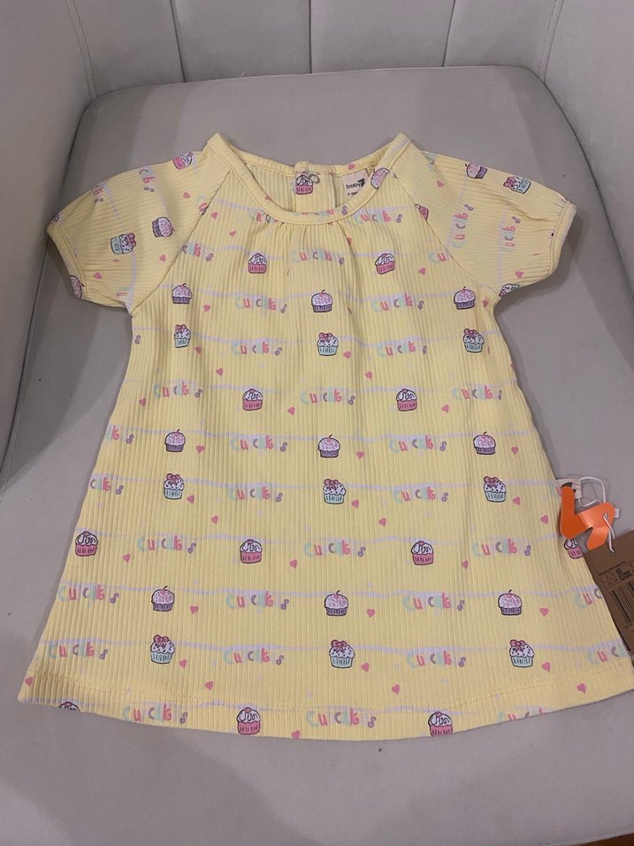 Pamuklu, kısa kollu, piliseli, bol kesim kız çocuk elbisesi. Pastel sarı renkte, cupcakelerle baskılı, günlük sokak stiline uygun.