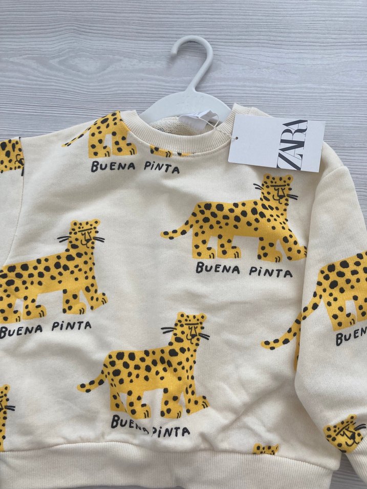Yumuşak kumaştan, uzun kollu, bisiklet yaka ve bol kesim kız çocuk sweatshirtü. Üzerinde leopar desenleri ve 'BUENA PINTA' yazısı baskılıdır.
