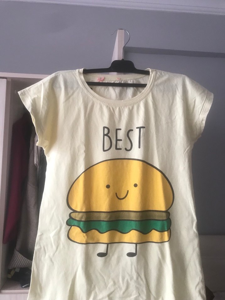 Kısakollu, yuvarlak yakalı, bol kesim kız çocuk tişörtü. Üzerinde sevimli burger baskısı ve "BEST" yazısı bulunur. Kumaşı yumuşak ve pastel sarıdır.