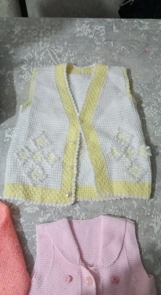 Kız çocuklar için pastel sarı nakışlı, V yakalı, kolu olmayan, bol kesim örgü süveter. Geleneksel tarzda, yumuşak örgü dokusu bulunur.