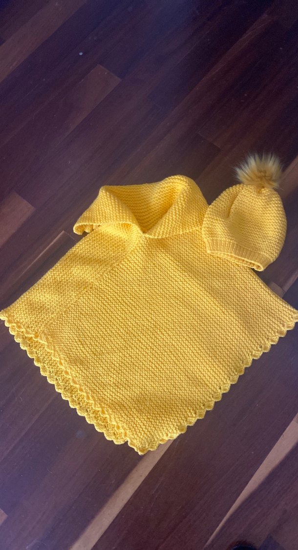 Renkli sarı örgü panço, bohem tarzıyla bol kesim ve boğazlı yakaya sahip. Yumuşak ponponlu uyumlu bere ile tamamlanır, kolsuz tasarım rahatlık sunar.