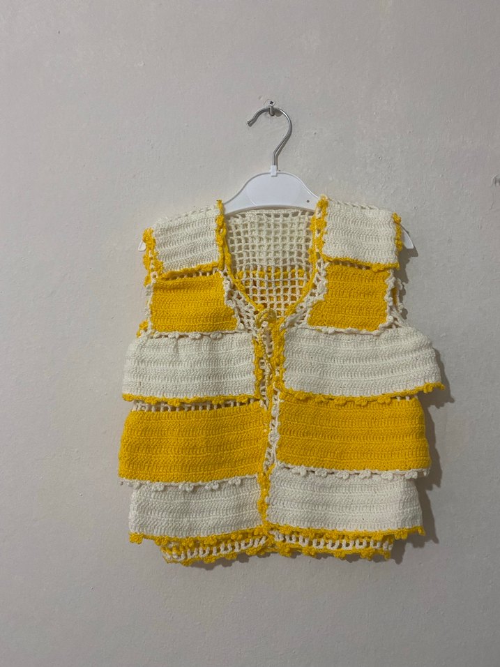 Sarı ve beyaz çizgili, örgü kız çocuk yeleği. Kolsuz, bol kesim ve yuvarlak yaka. Nakış detayları ile bohem ve retro tarzı sunar.