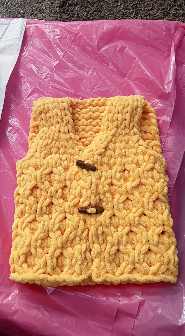 Kız çocukları için sarı renkte, bohem tarzda, boğazlı ve fit kesim örgü yelek. Dokulu örgü deseni ve ahşap tokalar bulunur.