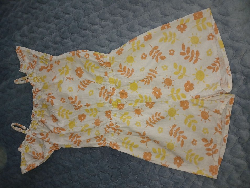 Sarı ve turuncu çiçek ile güneş desenli, straplez yaka ve ince askılı, bol kesim kız çocuk elbisesi.