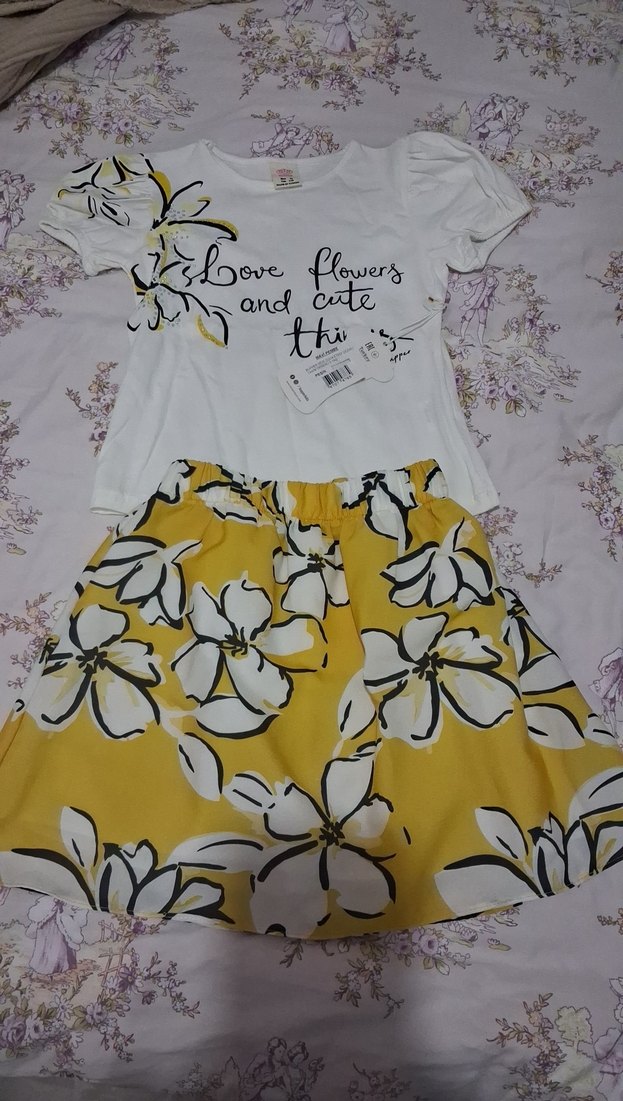 Bol kesim kız çocuk elbisesi, sarı çiçek desenli etek ve kısa kollu beyaz pamuk üstten oluşur. Dantel detaylı, straplez yakalı, bohem tarzda.
